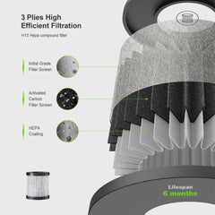 - 🍃【Higher Purification Performance】With a large expansion area and longer lifespan than others, the 3-Plies H13 True HEPA Filter works with ultra-fine Pre-filter and activated carbon filter, trapping 99. 97% of pollutants such as dust, smoke, pets' hair, and other particles/allergens are as small as 0. 3 microns. At the same time, the noise level is nearly voiceless with only 30db.
